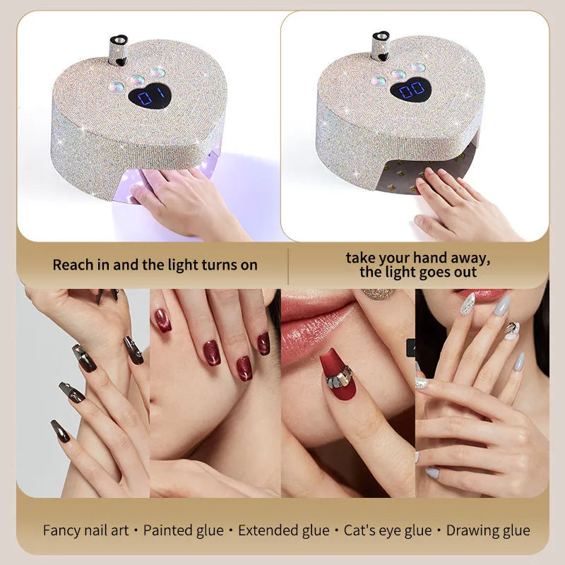 The X70 Diamond Cordless UV/LED Nail Lamp blends luxury design with multifunctional performance. Its diamond-inspired shell enhances style, while 42 LED beads at 86W ensure fast, even curing. Powered by a 9600mAh battery, it offers reliable cordless use. With three timer modes (30s, 60s, 90s), infrared sensor activation, and a detachable base for simple cleaning, it’s practical as well as elegant. A bonus mini nail lamp adds extra convenience for travel or detailed nail art.
