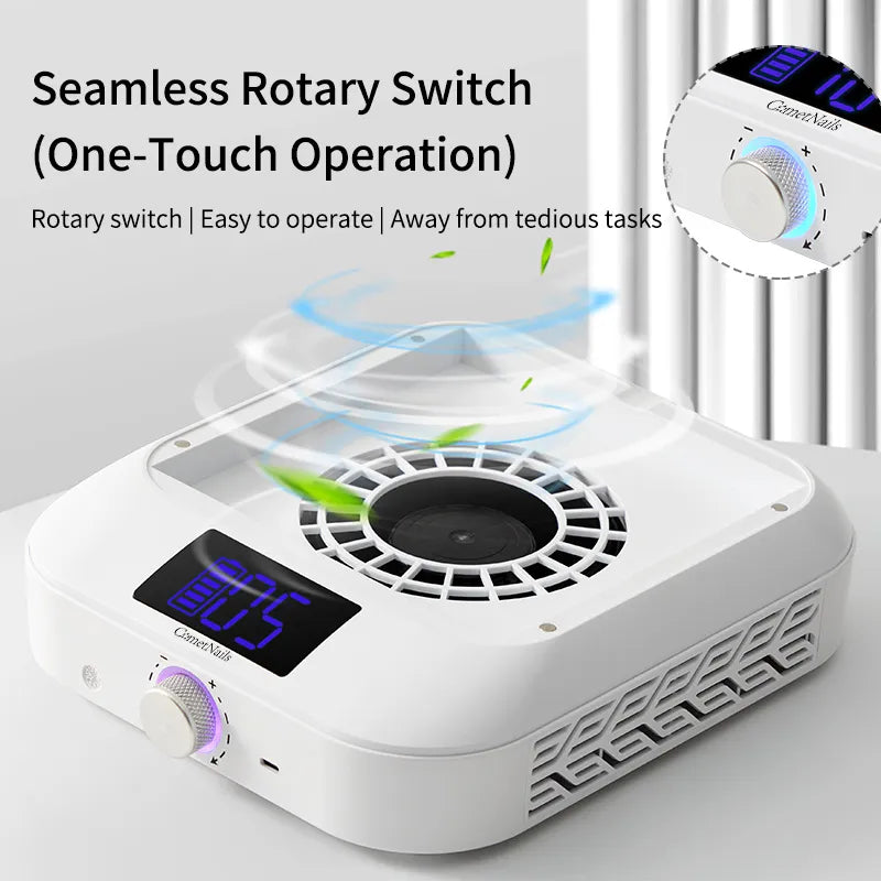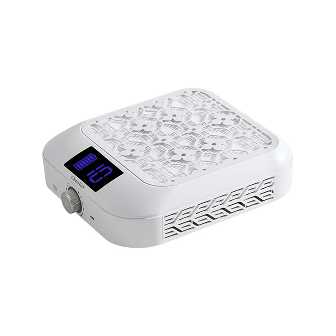 D20 rechargeable nail art dust collector combines high power with fashionable design, making it an essential tool for creating a clean and professional nail art experience. It is equipped with a powerful 66W brushless motor that speeds up to 3500rpm to vacuum efficiently while keeping noise low. With a 4500mAh battery capacity, it ensures wireless battery life. Made of aluminum alloy and ABS material, it is durable and available.